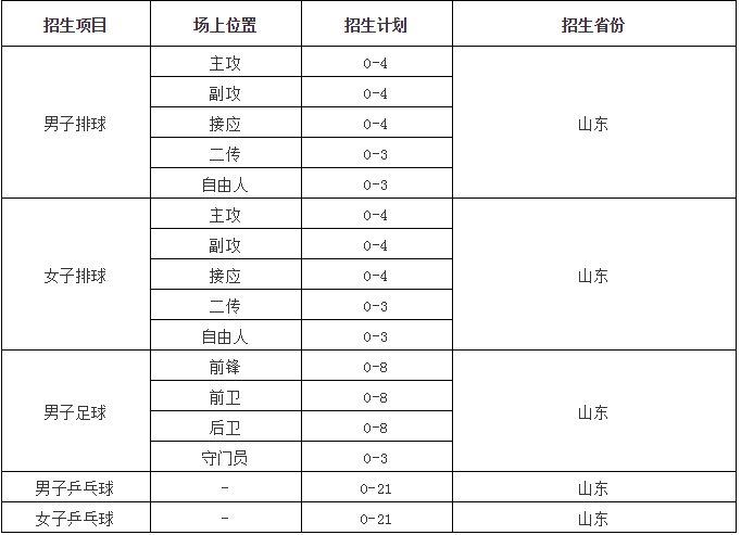 2、招生总计划不超过65人(全部在山东省内招生),其中:男子排球不超过6人,女子排球不超过6人,男子足球不超过11人,男子乒乓球不超过21人,女子乒乓球不超过21人。