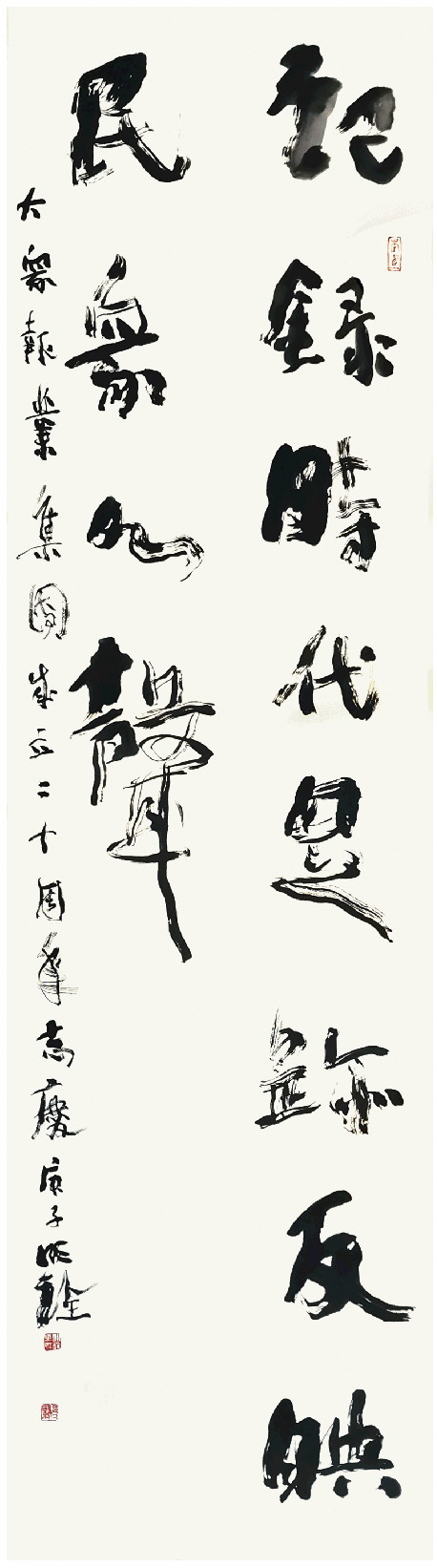 我和大众报业集团的感情很深。这些年,我的书法探索之路得到了大众日报社及大众报业集团旗下多家报刊的关注和支持。20世纪90年代,我创作了书写济南名城、名泉、名士的书法作品,后来又书写“一山一水一圣人”,一直坚持以书法为载体宣传传统文化。2016年,我先后在北京中华世纪坛和国艺美术馆举办了“大道之行——张仲亭书国学经典作品展”及“激扬文字——张仲亭书毛泽东诗词作品展”。北京展览之后,“张仲亭书法进京展汇报展”在山东新闻美术馆举办,这次展览是由大众报业集团主办的,我感到很荣幸,也很感动。2009年,我的书法作品《望岳》被中华人民共和国第十一届全国运动会开幕式碗幕视频选用,引起了很好的社会效应。2019年,《望岳》书法入选全运会开幕式十年之际,《大众日报》“大众书画”专刊以“弘扬国学 传承经典”为题,对我进行了采访,并作了整版报道,这对我又是很大的激励。今年是大众报业集团成立20周年,我以书法作品来献上祝福,希望与大家相互勉励,弘扬中华优秀传统文化,创作出更多有筋骨、有道德、有温度的作品。 ——张仲亭