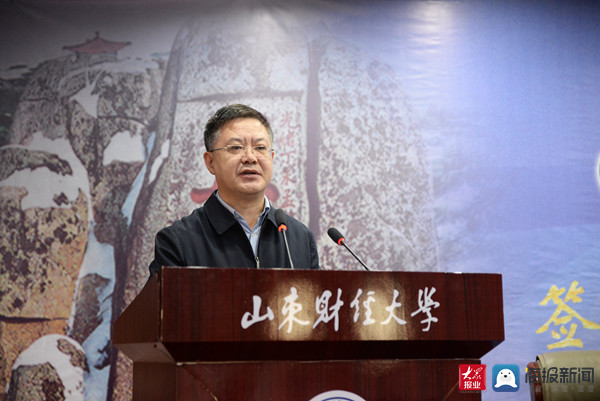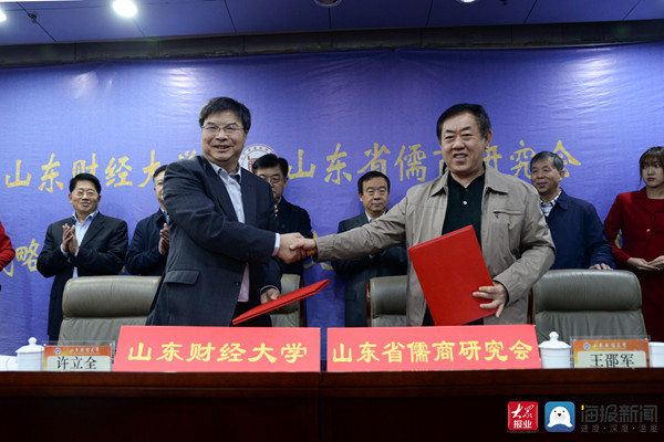 大众网教育·海报新闻讯 11月1日上午,山东财经大学与山东省儒商研究会签署战略合作协议暨儒商文化研究院揭牌仪式在山东财经大学舜耕校区天舜大厦文华堂举行。省委教育工委副书记、省教育厅党组副书记、副厅长白皓,教育部特聘教授、山东大学文学院院长杜泽逊,中泰证券有限公司党委书记李峰,山东省城市商业银行合作联盟有限公司董事长史跃峰应邀出席仪式。省政协原副主席、山东省儒商研究会会长许立全,副会长袁庆宏、孙传宏、宋玉山及重点会员单位代表出席仪式。山东财经大学党委书记王邵军,校长赵忠秀及学校相关职能部门负责人和文学与新闻传播学院部分师生参加仪式。仪式由张书学副校长主持。