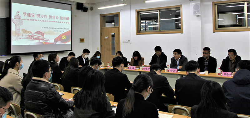 11月27日下午,山东财经大学国际经贸学院研究生党支部召开主题为“学‘建议’明方向 担使命 做贡献”的座谈研讨主题党日活动,学习贯彻党的十九届五中全会精神,山东财经大学校长赵忠秀参加活动并讲话。