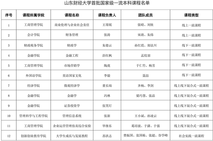 11月30日,教育部发布《关于公布首批国家级一流本科课程认定结果的通知》,公布了首批国家级一流本科课程认定结果,山东财经大学共有12门课程获批,位居省属高校第1位、全国财经类院校第3位,课程建设国内排名创历史新高。
