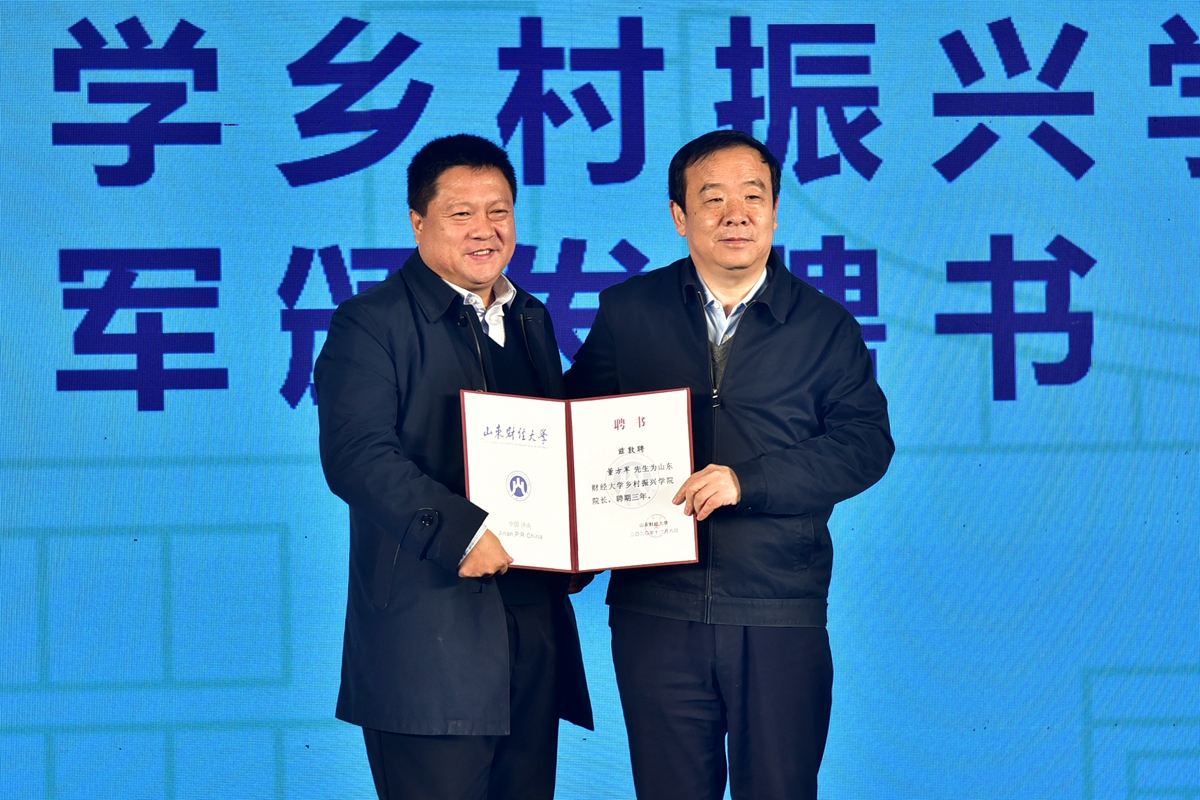 山东财经大学副校长张新和董方军、洪泰基金合伙人朱振华代表共建三方签署共建山东财经大学乡村振兴学院战略合作协议。