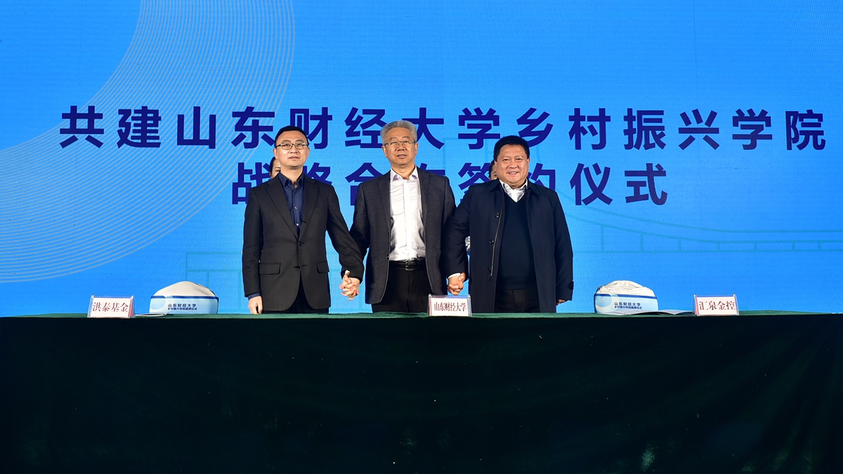 山东财经大学副校长张新和董方军、洪泰基金合伙人朱振华代表共建三方签署共建山东财经大学乡村振兴学院战略合作协议。