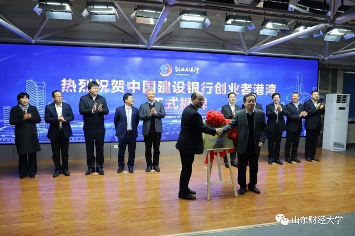 12月16日上午,山东财经大学与中国建设银行合作设立的“创业者港湾”,在历下区山东财经大学大学生创业园举行揭牌仪式。中国建设银行普惠金融事业部总经理张为忠和山财大党委书记王邵军共同为“创业者港湾”揭牌。
