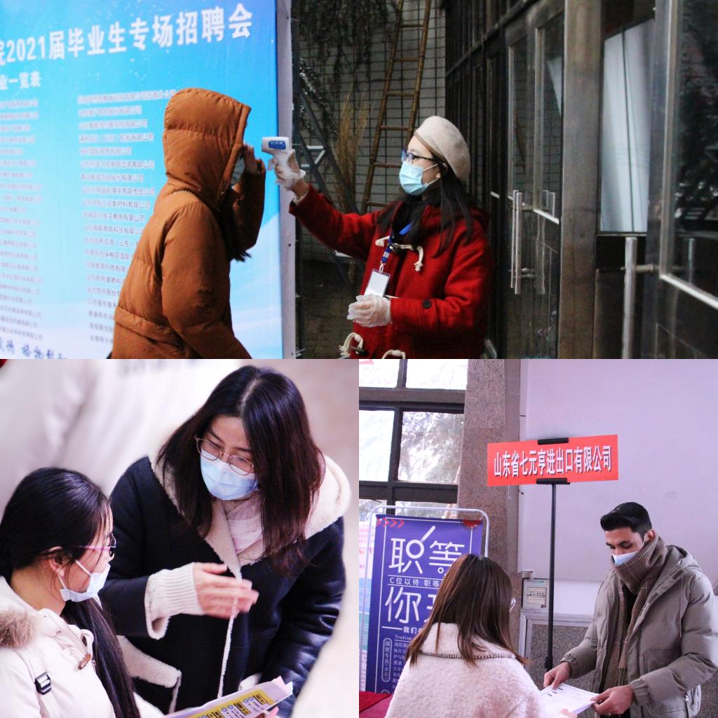 本次招聘会由国际经贸学院和就业处共同举办,省跨境电商协会和阿里巴巴科技有限公司山东分公司协办。本着防疫工作与就业工作并重的原则,国际经贸学院与就业处事先进行了周密的准备并制定了相应预案:对招聘单位进行了筛选,在报名的120余家单位中挑选了62家单位前来参会,婉拒了近一半的报名单位;通知凡有中高风险区旅居史或与有中高风险区旅居史的人有接触者或其他不符合防疫要求者一律谢绝参会;参会企业代表报到时需提交健康承诺书并凭健康码绿码方可入校入场,入场需科学佩戴口罩;学生分时段入场;所有入场者均需先测量体温等,确保防疫工作万无一失。