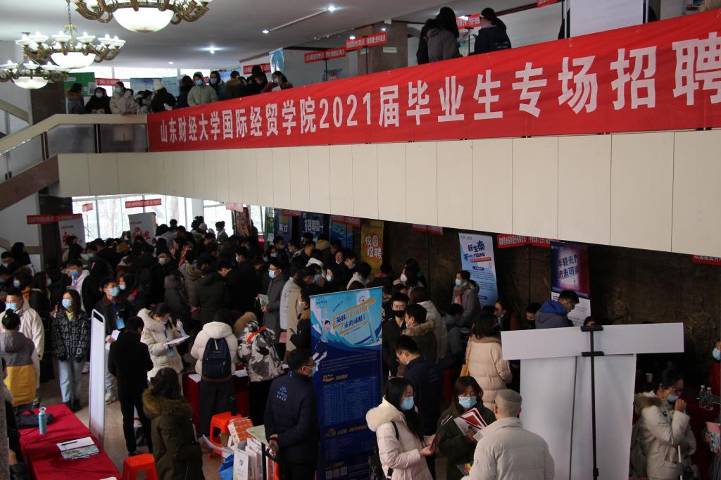 12月29日,山东财经大学国际经贸学院2021届毕业生专场招聘会在舜耕校区礼堂举行,中信证券(山东)有限责任公司、山东金谷控股集团有限公司等62家单位,为同学们提供了涉及外贸、财务、金融、外语等方向的近4000个岗位需求。招聘会现场,人头攒动,同学们认真阅读单位的招聘材料,询问单位情况,招聘人员则主动散发招聘彩页,耐心向同学们进行介绍。一上午的时间,参会毕业生达2000余人次。下午,10家企业进行了宣讲面试。