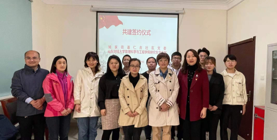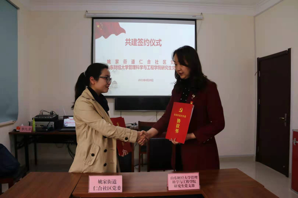 4月20日下午,山东财经大学管科学院党委与济南市历下区姚家街道仁合社区党委举行党建工作结对共建协议签订仪式。此次签约以研究生党支部为主对接社区党委,院党委副书记崔东峰、团委书记、研究生党支部书记何丽,社区党委负责人石磊、社区部分专职工作人员和学院研究生党员代表参加签订仪式。