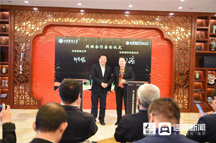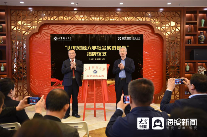 大众网·海报新闻讯( 通讯员 邵伟然) 4月29日下午,山东财经大学与北京银行济南分行战略合作签约暨大学生社会实践基地揭牌仪式在北京银行济南分行举行。副校长张新、北京银行济南分行行长、88级计划统计专业校友房旭,副行长田宏、行长助理廖瑾等出席活动。