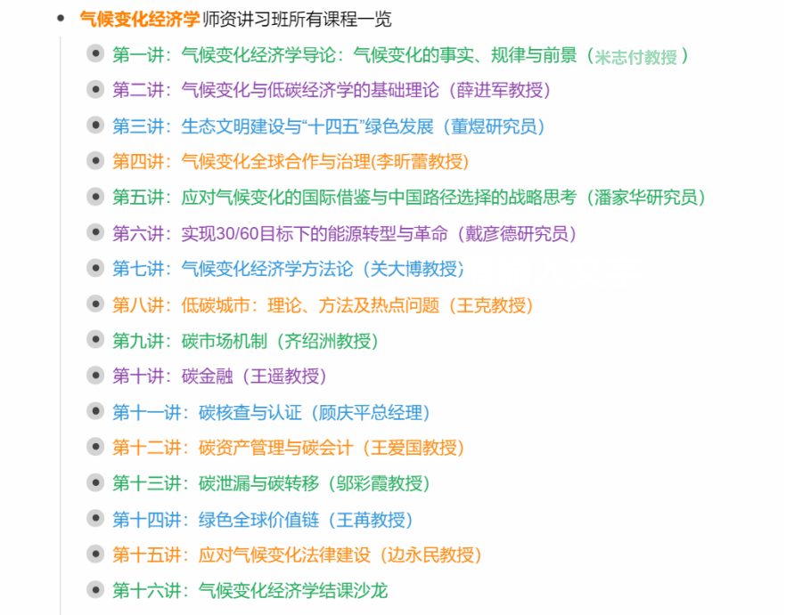首届气候变化师资讲习班课程邀请国内外20位气候变化领域知名专家进行了16次课程讲习,内容涵盖气候变化经济学理论及实务,注重理论讲授和学术前沿,主题涉及气候变化科学认知、基础理论、方法论、国家战略与规划、全球气候治理与合作、低碳城市理论与实践、碳市场与碳金融、碳资产管理与核查、碳泄漏与碳转移、绿色全球价值链、应对气候变化法律建设等。单篇浏览量最高达20252次,总播放量达110000次以上。