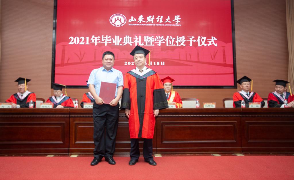 在学位授予仪式之后,举行了杰出校友证书颁发仪式。王邵军走到台前,与杰出校友董方军握手祝贺并颁发证书。董方军系我校1996级校友,现为山东省政协常委、深圳东方汇泉金融控股集团公司董事局主席、山东财经大学乡村振兴学院院长。他在致辞中希望学弟学妹们不断学习,紧跟时代步伐。要做有理想有信念的人,并为之专注与坚守;要踏踏实实做事、实实在在做人;要知感恩,存善意,运用自己的所学所获,对他人对社会有所贡献。