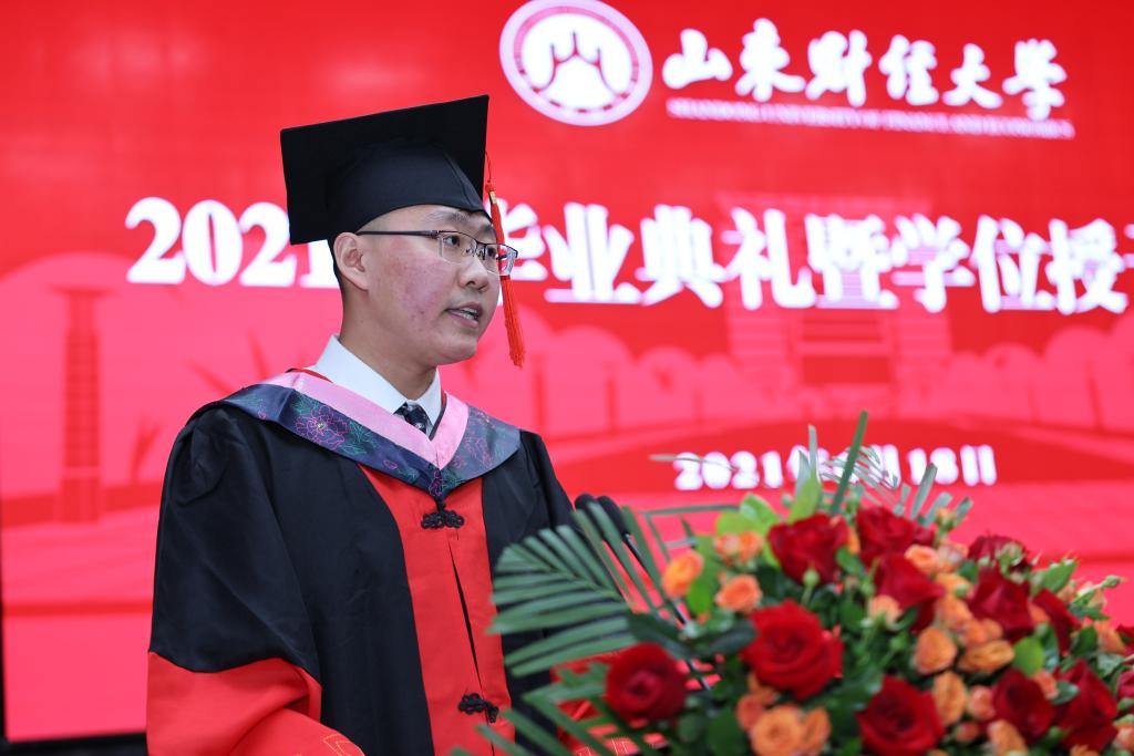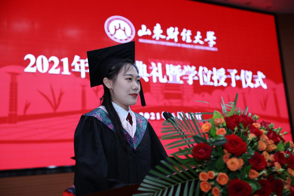在毕业生代表发言环节,统计学院博士研究生陈昊、管理科学与工程学院王紫茗,先后表达了对母校、对恩师、对同窗的感恩和不舍,表示将秉承财大精神,牢记师长嘱托,努力拼搏,不负韶华,用奋斗报效祖国,用青春谱写华章。