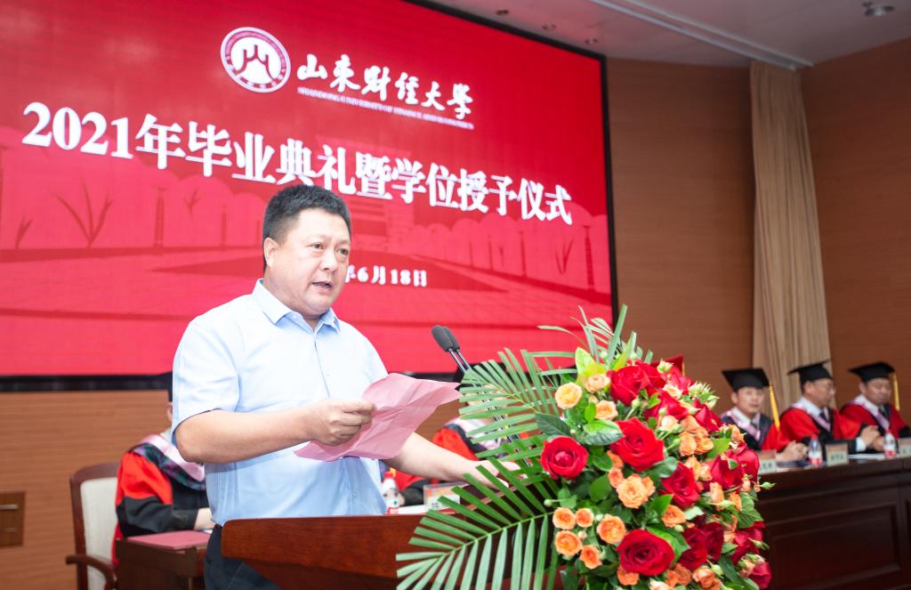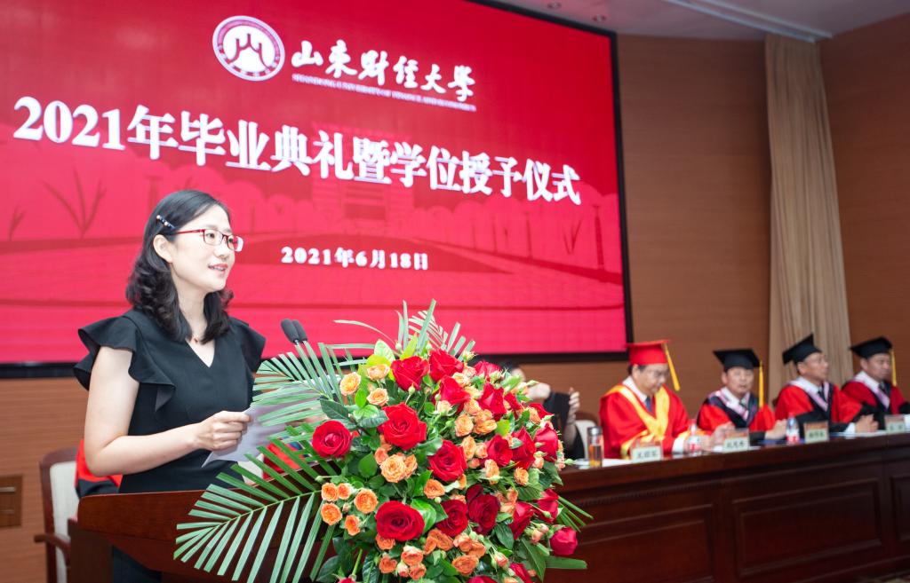 教师代表、山东省高校优秀青创团队带头人、博士生导师、统计学院李娜教授在致辞中表达了对毕业生的祝福和期望。她勉励毕业生们要坚定理想信念,提高政治素养;要艰苦奋斗,锲而不舍,让理想在奋斗中升华,让青春在拼搏中闪光;要探索创新,努力实干,发扬“三牛”精神,争当“创新发展、攻坚克难”的“拓荒牛”,守正创新,立志实干,做新时代有为青年。