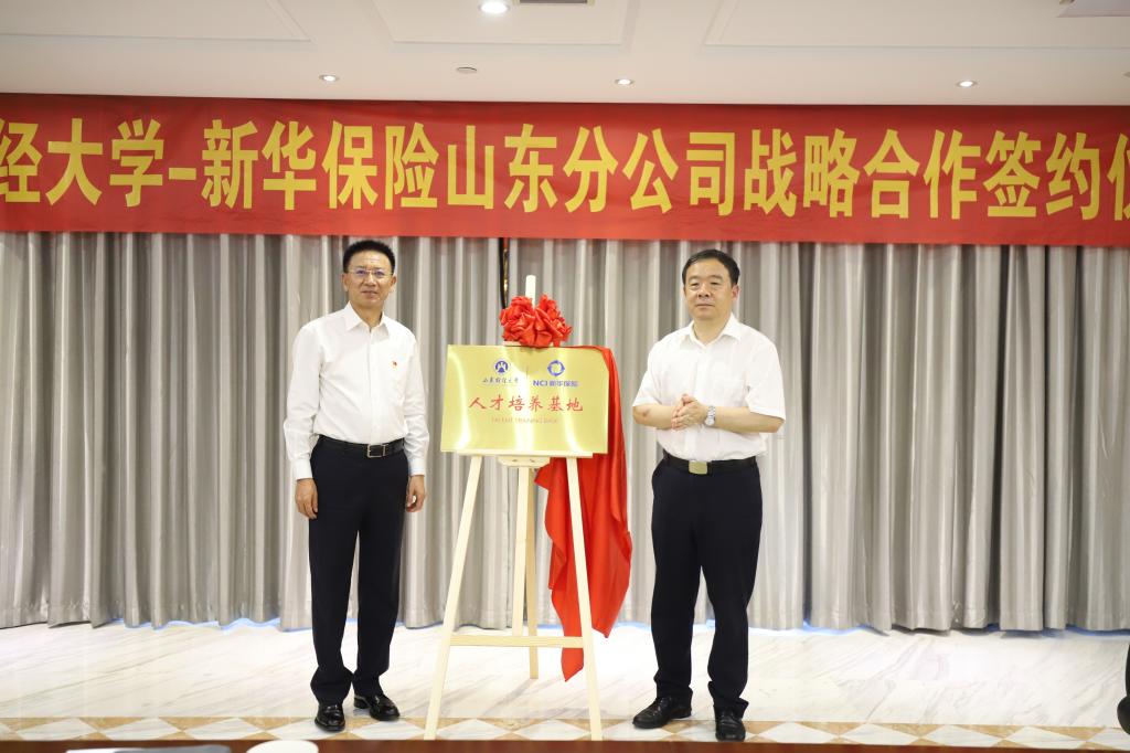 王邵军与刘崇松为山东财经大学新华保险人才培养基地揭牌;陈晓兰与张俊国代表双方签署战略合作协议,并为山东财经大学就业实习基地揭牌;继续教育学院院长张亦工与新华保险山东分公司个险营销部总经理于武圣为山东财经大学继续教育学院新华保险分院揭牌。