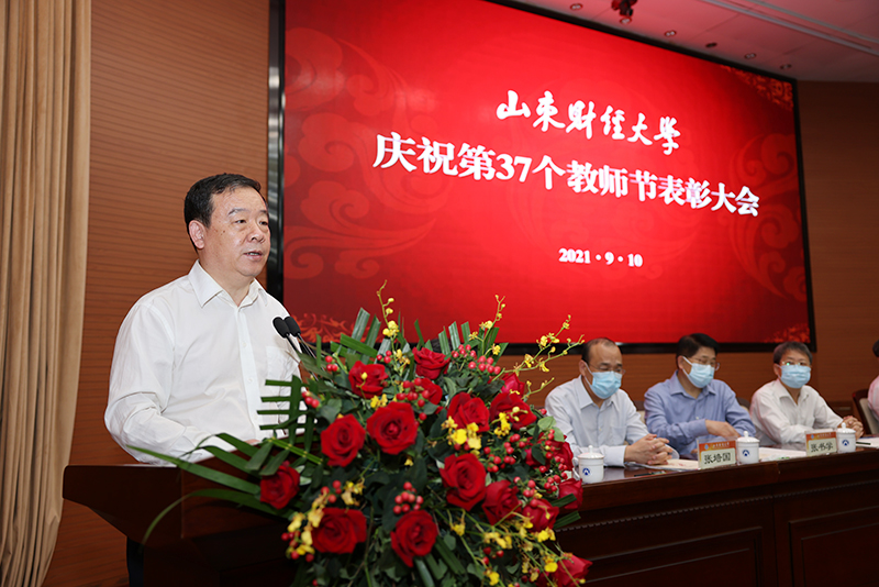 王邵军在讲话中首先向全体教职工致以节日的问候,向从事高等教育满30周年的教职工表示诚挚慰问,向刚入职的新同事表示热烈欢迎。他说,一年来,全校教职工忠诚党的教育事业,牢记教书育人职责,在平凡的岗位上做出了不平凡的业绩,促进了学校事业高质量发展。在人才培养方面,今年新增12个国家级一流本科专业建设点、6个省级一流本科专业建设点,国家级一流本科专业建设点达到25个、省级一流本科专业建设点达到8个,一流专业建设点占招生专业总数的64%,在全国财经类高校和全省高校中名列前茅;第二批省一流本科课程认定56门,其中35门推荐参评国家级一流本科课程,均居省属高校第一。在本科招生方面,今年录取线超出山东省特招线29分,全省前10%考生占比近75%,最低录取位次升至省属高校第2位,实现新跨越。在科研方面,获国家社科、国家自科立项32项,教育部人文社科项目立项13项。多名教师获得国家级、省部级荣誉称号。学校在去年省属高校绩效考核中获得“优秀”,位列全省第2名。这些成绩的取得,是全校师生员工共同努力的成果,更是广大教师和教育工作者辛勤耕耘的结果。