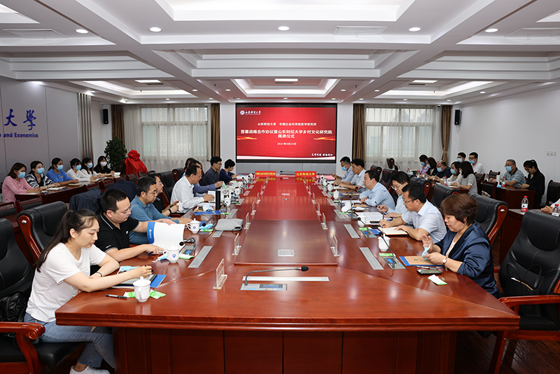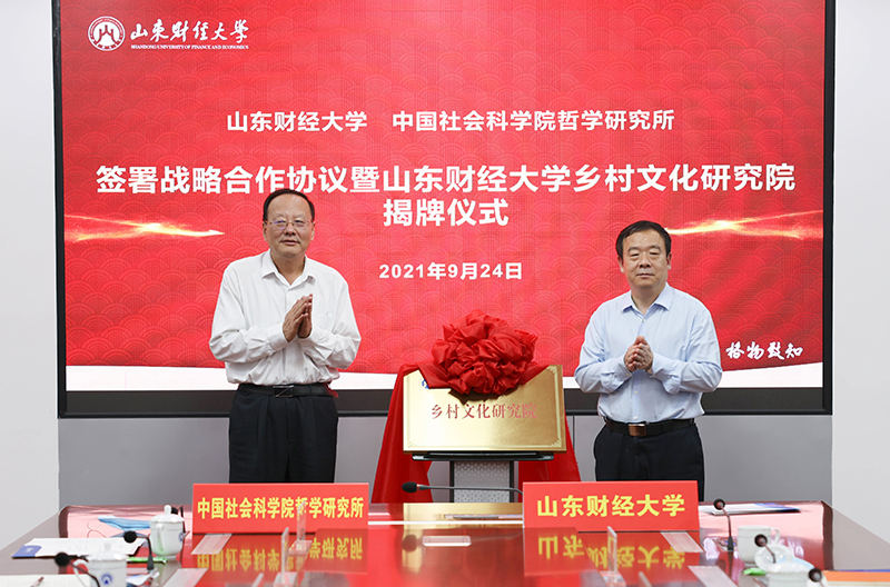 张书学和单继刚代表双方签署战略合作协议,王邵军和王立胜共同为“山东财经大学乡村文化研究院”揭牌,与会人员共同见证了山东财经大学乡村文化研究院的正式成立。