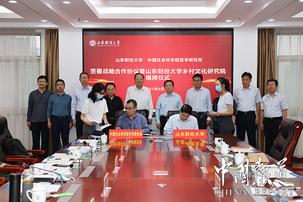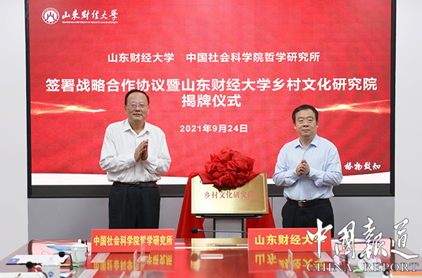中国报道讯(尹洪臣 通讯员于洪良)9月24日下午,山东财经大学与中国社会科学院哲学研究所签署战略合作协议暨山东财经大学乡村文化研究院揭牌仪式在燕山校区举行。中国社会科学院哲学研究所党委书记、副所长王立胜,哲学研究所副所长单继刚,山东财经大学党委书记王邵军以及中国社会科学院哲学研究所代表、山东财经大学相关职能部门负责人、文学与新闻传播学院、马克思主义学院师生代表参加仪式。副校长张书学主持仪式。