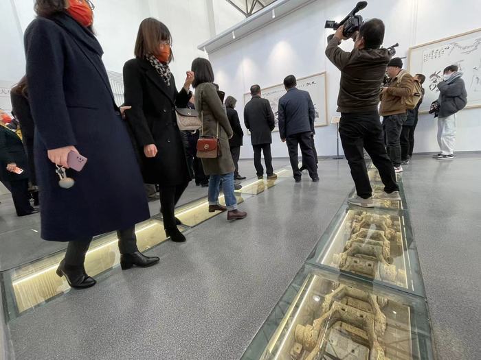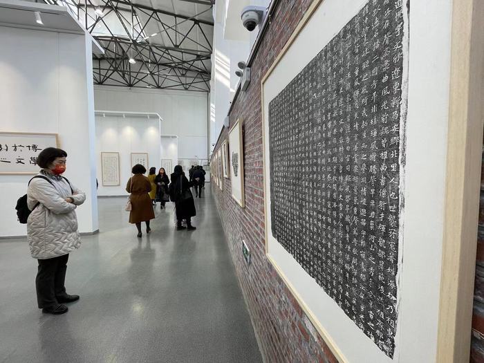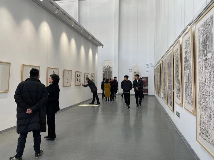 美术馆内举办了山东财经大学艺术藏品展,本次展览的展品为山财大长期以来收藏积累的当代艺术名家及秦、汉、魏晋南北朝的碑刻原拓。其中,《泰山刻石》《五凤二年刻石》《张迁碑》等拓片皆为中国代表性碑版,有重要的金石学和书法研究价值;《泗水升鼎》《孔子见老子》《七盘舞》等汉画像石拓片,特别是收藏的大量嘉祥武氏祠拓片内容丰富、题材多样,让观展者对汉代的时代风貌有了更深切的理解。