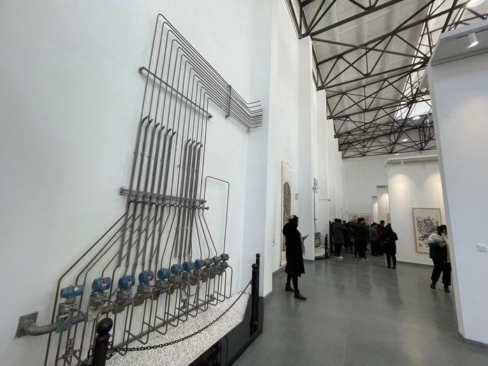 海岱美术馆内不少原锅炉房的老部件体现了独特的“工业风”,玻璃地面中镶嵌的齿轮、墙上悬挂的阀门等设施引得不少参观者驻足。