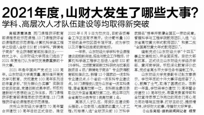 商报济南消息 两门课程获评教育部课程思政示范课程、13门课程获评省级课程思政示范课程;计算机科学继工程学之后进入全球ESI前1%学科,“跨境电子商务”专业获得教育部批准设立;……昨天上午,山东财经大学师生们选出了2021年度他们认为学校发展最重要的十件大事。
