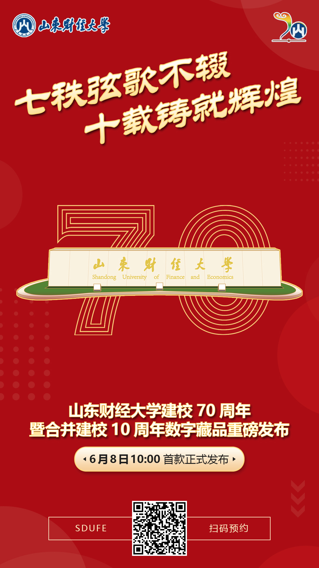 6月9日,山东财经大学即将迎来建校70周年暨合并建校10周年校庆。为丰富校庆活动,弘扬财大精神,增进校友感情,山东财经大学面向财大校友、学子及社会公众发布四款数字藏品,共同喜迎七秩华诞,为山东财经大学庆生!