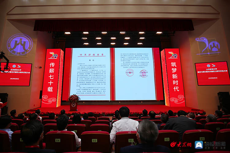 当天上午10时许,庄严的国歌声响起,全体起立。主席台正中央,山财大校标和校庆徽标并排而立,红底白字的“山东财经大学建校70周年暨合并建校10周年庆祝大会”字样赏心悦目;主席台两侧“传薪七十载,筑梦新时代”高大立柱鲜艳夺目,标示着山财大已走过七十载风雨历程;会场后方,“铭记为党育人为国育才初心使命,奋进全面建成全国一流财经特色名校新征程”大红横幅高悬,印刻着山财大始终坚守的“克明峻德 格物致知”校训精神,整个会场一派吉庆祥和气象。