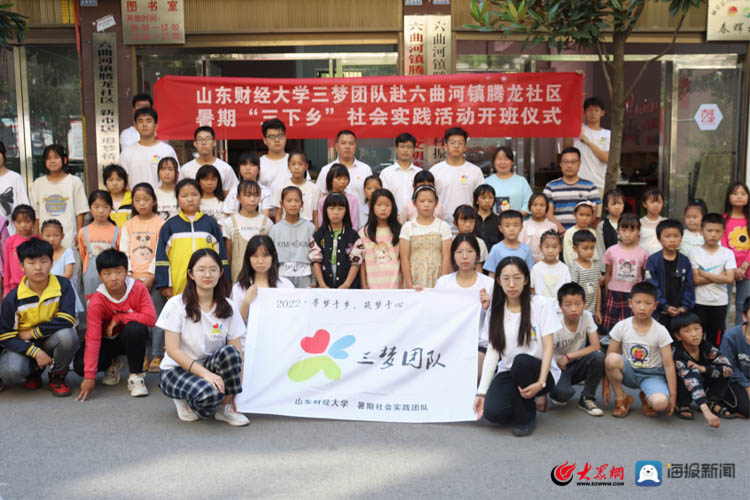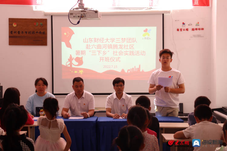 2022年7月15日,山东财经大学三梦团队于贵州省毕节市赫章县六曲河镇腾龙社区举行暑期三下乡社会实践活动开班仪式,并捐赠少儿图书200余册,随后团队将在该社区为160余名儿童提供为期两周的支教活动。本次活动由六曲河镇组织委员王关贵同志主持,共青团赫章县委沈昌俊同志,腾龙社区两委成员、山东财经大学三梦团队成员及各村(社区)学生、家长参与。