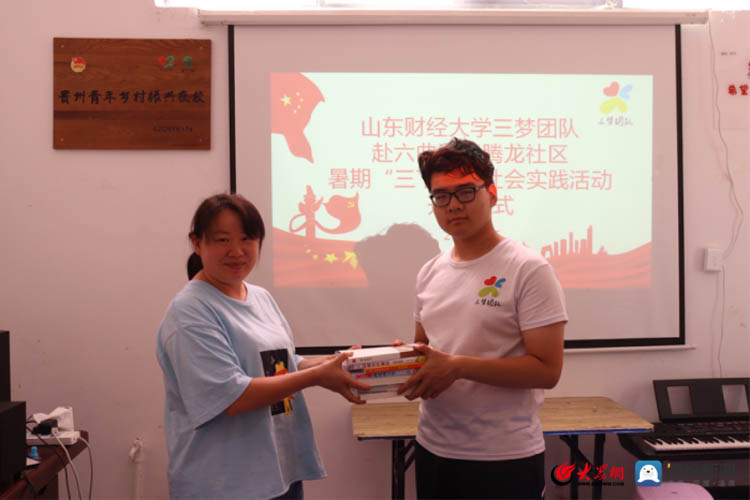 在此次开班及捐书仪式中,沈昌俊同志表示社会实践是大学生了解世界,认识世界的主要途径,是促进社会和谐的重要形式,而山东财经大学三梦团队的此次支教,不仅是山财大与赫章县友谊的体现,也是两地交流合作的又一形式。沈昌俊同志对同学们提出了三点希望,一是希望同学们在活动中将书本知识与参与社会实践结合起来;二是希望同学们在此次实践中收获真知,增长才干,获得不一样的暑期感悟;三是希望同学们注意自身安全,及时有效处理突发问题。三梦团队代表曹博文表示三梦团队多年来坚持以“寻梦、筑梦、圆梦”为宗旨进行各类服务志愿活动,本次团队选择为六曲河镇腾龙社区的孩子们捐赠传统文化、红色经典书籍,希望以自身力量做出实际贡献,帮孩子们养成良好的阅读习惯,领略更广阔的世界,见识更遥远的未来。