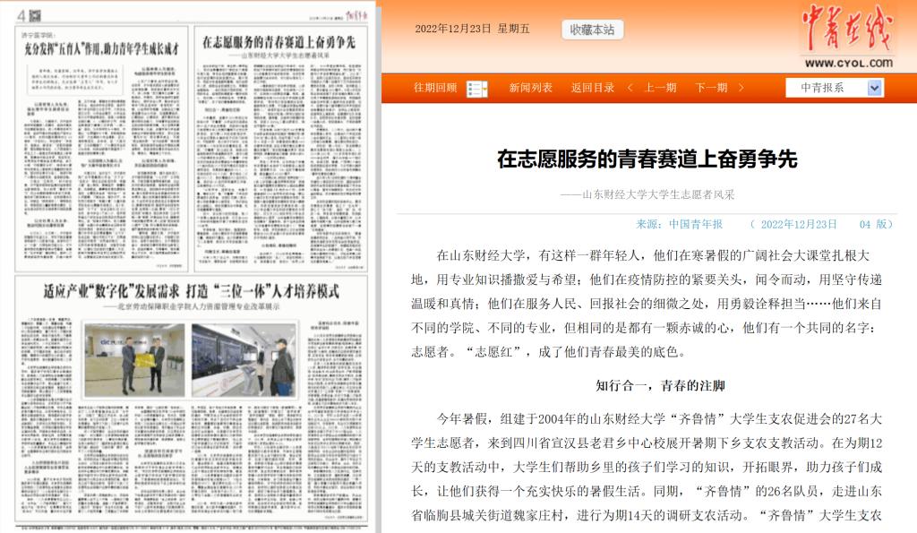 学校的“第一书记+”扶贫新模式青年志愿服务团队聚焦三全育人,从2014到2020年,300多支服务团队的3000余名成员,遍及山东省16个地级市,走进江西、福建、广西等8个省份的贫困地区进行考察,为乡村振兴提供志愿服务,因此被评为山东省先进集体(青年志愿服务集体)。