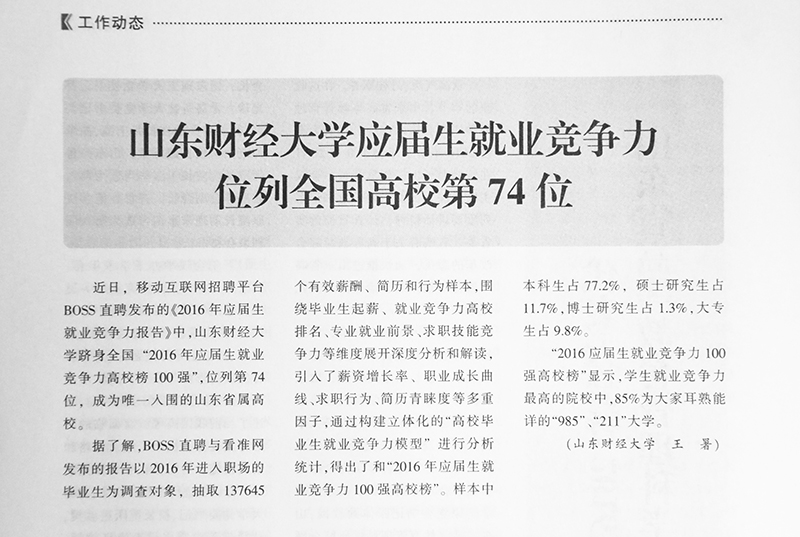近日,移动互联网招聘平台BOSS直聘发布的《2016年应届生就业竞争力报告》中,山东财经大学跻身全国“2016年应届生就业竞争力高校榜100强”,位列第74位,成为唯一入围的山东省属高校。