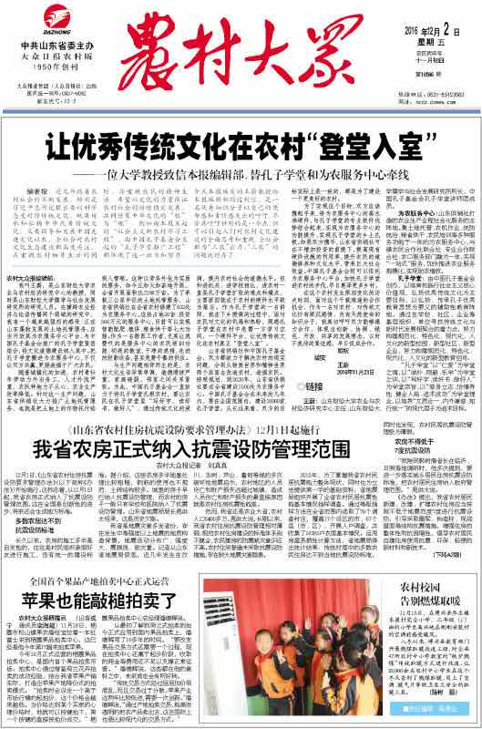 我叫王蔚,是山东财经大学农业与农村经济研究中心的教授,同时是山东财经大学儒学与社会发展研究所的研究人员。在横跨农业经济与论语传播两个领域的研究中,我有一个越来越强烈的感受:正在山东蓬勃发展的土地托管服务,应当开放其为农服务中心平台,与中国孔子基金会推广的孔子学堂紧密结合,将文化道德建设纳入其中。把孔子学堂搬进为农服务中心,不仅让双方共赢,更能造福于广大农民。