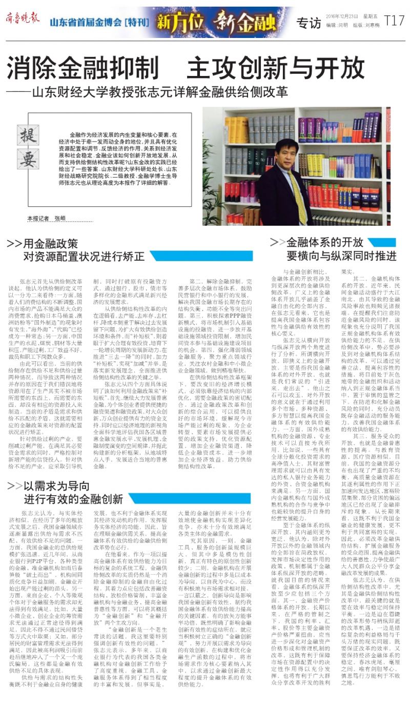 金融作为经济发展的内生变量和核心要素,在经济中处于牵一发而动全身的地位,并且具有优化资源配置和调节、反馈经济的作用,关系到经济发展和社会稳定。金融业该如何创新开放地发展,从而支持供给侧结构性改革呢?山东金改的实践已经给出了一些答案。山东财经大学科研处处长、山东财经战略研究院院长、二级教授、金融学博士生导师张志元也从理论高度为本报作了详细的解答。