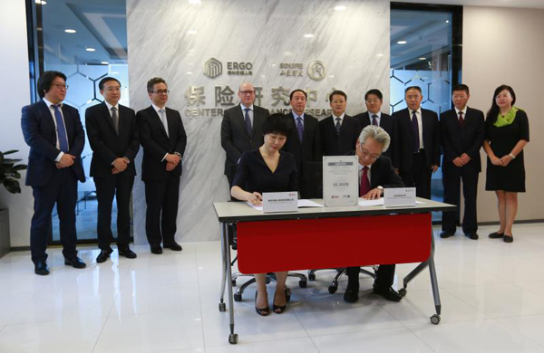 中保网讯 9月12日下午,德华安顾人寿保险有限公司与山东财经大学签署合作协议,山东省首家精算奖学金——“德华安顾人寿精算奖学金”在山东财经大学设立。德国安顾集团股份公司董事会主席瑞思博士,德华安顾人寿董事长史峰磊,副董事长思勇明和董事、总经理殷晓松,山东财经大学校长卓志,副校长胡文波、韩作生出席签约仪式。
