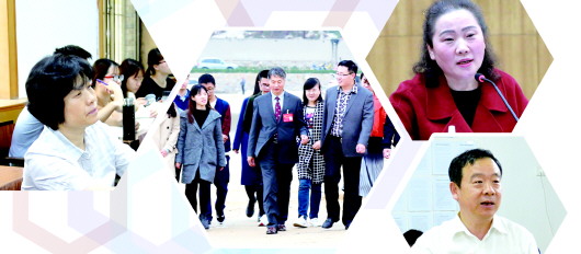 十九大代表左敏(左)、于长军(中)、杨秀玉(右上)、王邵军(右下)以各种方式,向广大干部群众宣讲十九大精神。