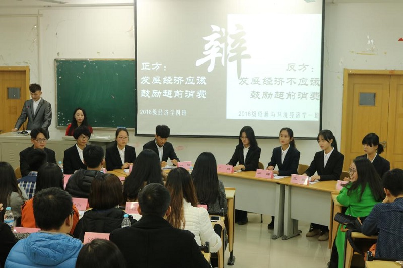 决赛双方围绕“发展经济是否应当鼓励超前消费”的辩题展开辩论。正方先声夺人,以“鼓励超前消费对发展经济具有促进作用”为论点展开理论陈述,从经济量的积累、经济质量的提高、经济结构的完善三方面着手,妙语连珠,势如破竹。反方思维缜密,机智应变,以“鼓励超前消费会给经济发展带来不可忽视的负面影响”为切入点,运用直接和间接两种方法,结合个人和社会两个层面,立稳阵脚,层层剖析。双方辩手唇枪舌剑,旁征博引,展开激烈交锋,赛场气氛紧张激烈。中场休息阶段,双方亲友团带来精彩的歌曲串烧和街舞表演,现场精彩不停,掌声不断。最终2016级经济学四班摘得桂冠,资源与环境经济学一班获得第二名;朱青、谢春旭等6名同学获得优秀辩手称号。