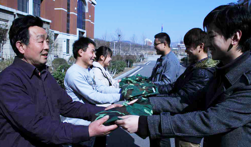 3月25日下午,金融学院军训迷彩服捐赠仪式在明水校区举行,160余套迷彩服送到了山东港基建设集团工人们的手中。