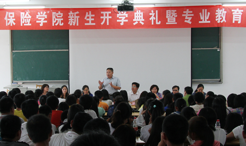 闫庆悦在致辞中由人类知识学科的的划分开始讲起,深入浅出地阐述了经济学的内容以及保险学专业的由来,并着重指出保险学的发展以及就业前景。他以诙谐的语言由浅入深地告诉同学们什么是知识,为什么追求知识,最后回归到保险学之于社会的重要意义。同时他提出了三点建议:要强身健体,提高身体素质;树立高远的目标,养成良好的学习习惯,选择适合的学习环境,心无旁骛;要注重培养自己的集体荣誉感,尊重师长‘爱护同学,多关心公共事务。