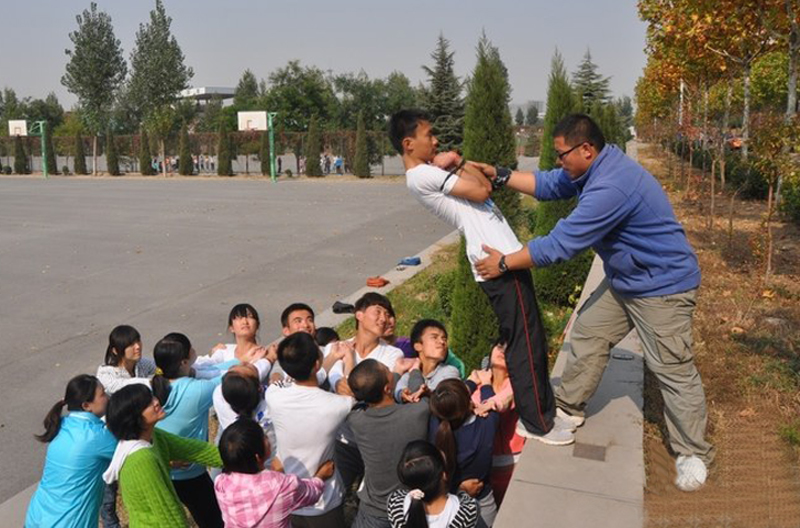 每天两个班的同学被分为四支队伍,队员们首先通过选队名、做队旗、唱队歌、喊队伍口号的方式迅速融入角色。依照教练讲授,亲身参与和体验总结的方式,先后完成了“信任背摔”、“盲人方阵”、“电网逃生”、“急速60秒”、“真情传递”、“一圈到底”、“激情节拍”等专业素质拓展项目。经过锻炼,同学们认识到自信和互信的重要性;学到人员调配和团队协作的方法;体会到组织管理创新和系统思考的价值;领悟到良好、有序沟通和卓越领导力的真谛。