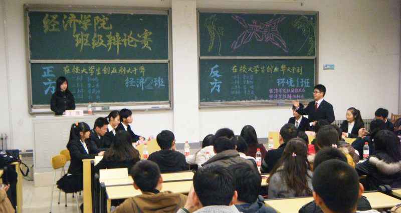 本次比赛分为初赛、复赛两阶段,历时三周多,经济学院2012级七个班级参赛。在初赛阶段,2012级经济二班和环境一班一路过关斩将,突出重围,以雄厚的实力入围决赛。在决赛立论陈词、驳辩、盘问、攻辩小结、自由辩论、总结陈词等环节中,双方就“在校大学生创业利大于弊还是弊大于利”展开激烈辩论。两位一辩慷慨陈词,胸有成竹,志在必得,用大量论据论证本方观点;攻辩盘问环节中,双方你来我往,思维敏捷,逻辑严密,灵活应变,妙语连珠。攻辩小结中,双方辩手条理清晰,系统全面地阐述本方观点,并一针见血地指出对方偏颇之处,双方上演了一番唇枪舌战。短兵相接的针锋相对后,双方辩手亲友团倾情献上轻松幽默的小品,别出心裁的情景演绎为本班代表队加油打气。在总结陈词环节中,双方四辩对本方例证做总结概括,力求在驳论和说理上做最后有力的一击。