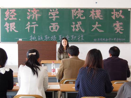 4月13日,由经济学院学生会举办的“挑战职场,职来职往——模拟银行面试大赛”活动在圣井校区进行。中国建设银行山东省分行营业部人力资源部副总经理孙中会、经理庞梦雨担任评委。经济学院圣井校区11级、12级同学参加此次活动。