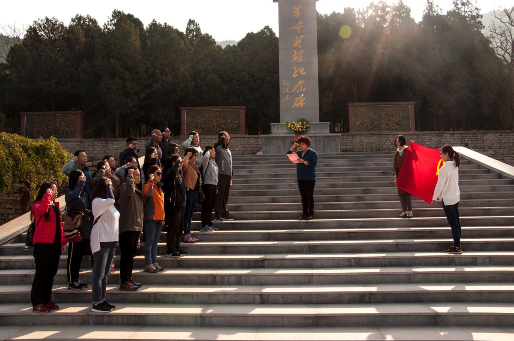 大峰山抗日根据地是泰西抗日根据地的重要组成部分,历史上为中华民族的解放事业做出了卓越的贡献。现在是济南市重要的革命传统及爱国主义教育基地。在苍松翠柏掩映下的革命烈士纪念碑前,全体党员认真聆听讲解员对大峰山地区革命事迹的生动介绍,详细了解大峰山作为抗日战争期间“长清的小延安”做出的重要贡献和巨大牺牲,深切缅怀在大峰山英勇献身的革命先烈。在庄严肃穆的气氛中,全体党员向革命烈士敬献花篮并集体默哀。在鲜红的党旗前,学院党委书记杨春丽同志带领大家重温入党誓词,共同表达了继承革命先烈遗志,不忘初心,永远忠诚于党和人民,为中国特色社会主义伟大事业贡献一切的拳拳决心。