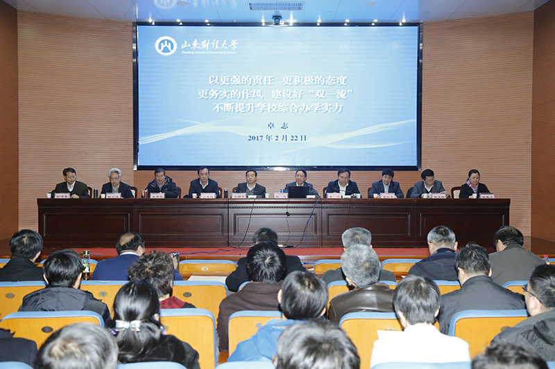 校长卓志作了《以更强的责任、更积极的态度、更务实的作风,建设好“双一流”,不断提升学校综合办学实力》的工作报告。包括四个部分,一是分析我国“双一流”建设背景和各主要省份的主要做法,二是介绍山东省“双一流”建设方案和特点以及我校的情况,三是分析我校推进“双一流”建设的任务、思路和工作要求,四是部署2017年主要工作。