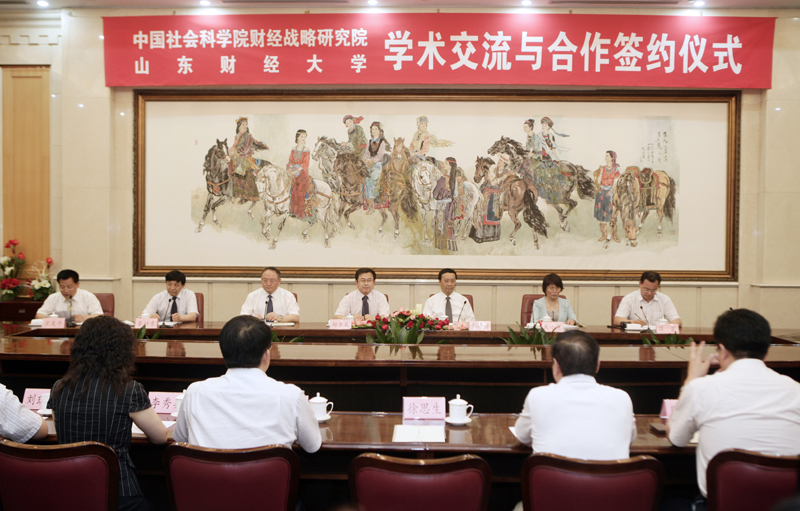 6月8日下午,中国社会科学院财经战略研究院与山东财经大学学术交流与合作签约仪式在山东大厦隆重举行。中国社会科学院财经战略研究院院长高培勇、学术交流办公室主任朱小慧、山东财经大学党委书记郝书辰、校长刘兴云、副校长綦好东、副校长崔友平、中国社会科学院财经战略研究院有关人员、山东财经大学有关处室及二级学院负责人参加了仪式。高培勇和刘兴云分别代表中国社会科学院财经战略研究院和山东财经大学签署了学术交流与合作协议书。崔友平主持了签约仪式。