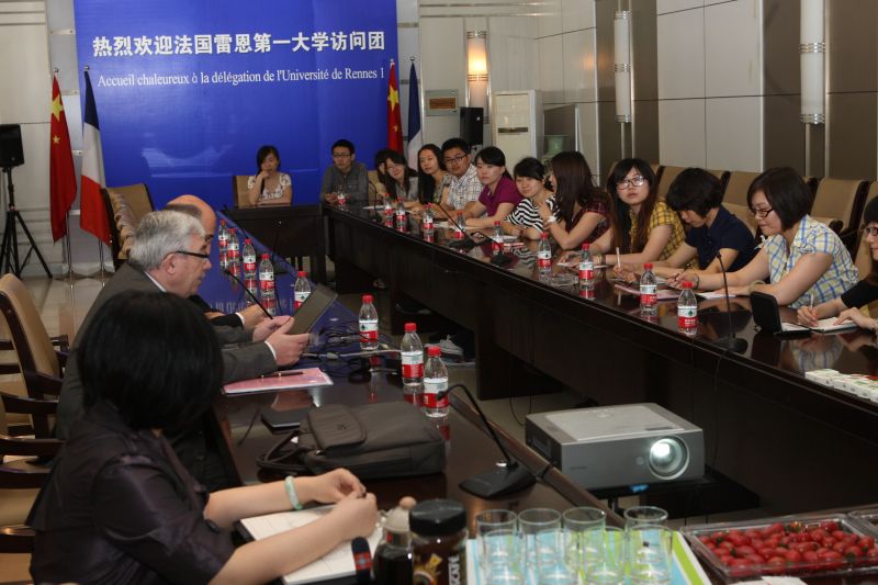 会前,代表团成员亲切会见了我校即将赴雷恩第一大学学习的学生,Marc Gaugain教授向同学们具体介绍了雷恩一大交流项目在专业选择、课程设置等方面的情况。同学们踊跃发言,并就赴法学习方面向二位教授提问,气氛十分热烈。随后,两位教授对申请雷恩一大研究生项目的同学进行了面试。