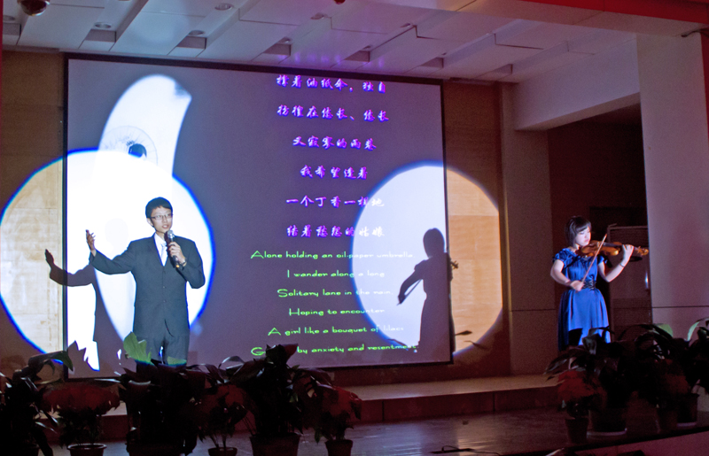 诵读会共分为“国风古韵”、“中国往事”、“异域文情”和“时代之风”四部分。其中,古筝伴奏下的《水调歌头》与明月遥相呼应,表达了但愿人长久的美好祝福;《论中国会计精神》让我们重新将“诚信”铭记在心;席慕容与余光中的两首《乡愁》,在学生和老师的口中,道出了不一样的情绪;《相信未来》让我们看到了在逆境中寻找希望的执着与乐观;师生共同演绎的《四月的纪念》感人至深,让大家仿佛回到了朦胧诗的时代,见证了对爱情的渴望与纯粹;而《我骄傲,我是中国人》又一次让我们坚信,黑水晶般的眼眸与黄土地色的肌肤都是我骄傲的理由!
