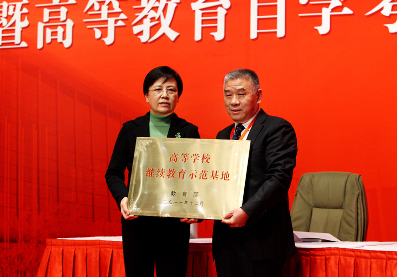 会议期间举行了国家级高等学校继续教育示范基地的授牌仪式,我校被批准为“高等学校继续教育示范基地”。基地建设负责人、我校继续教育学院教授、山东省财政职工大学常务副校长韩庆华代表学校参加授牌仪式,并接受教育部副部长鲁昕授牌。