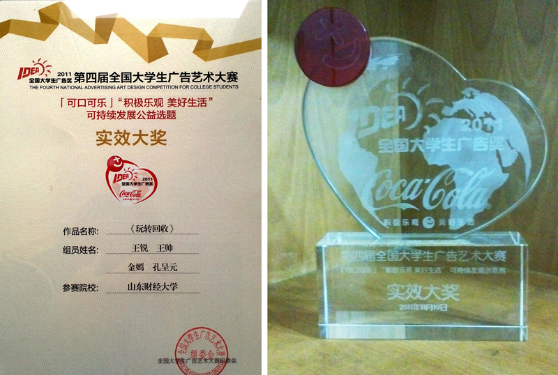 由艺术学院教师马洪骥指导,08级广告学专业王锐、王帅、金嫣、孔呈元同学共同创作的《玩转回收》作品,从10000余件作品中脱颖而出,作为山东赛区唯一作品闯入全国20强,经过近四个月的网络投票、进入全国总决赛评委终选阶段,经过评委认真比对、反复论证,得到大赛组委会一致认可,获得最终的实效大奖,赢得了可口可乐公司赞助去南极考察的宝贵机会。
