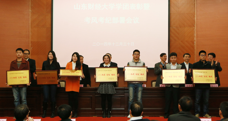 12月30日下午,山东财经大学学团表彰暨考风考纪部署会议在燕山校区举行。校党委书记刘兴云、校长卓志,副校长聂培尧、李明勇、吴彬,纪委书记杨天梅,长城融资租赁有限责任公司董事长张发军先生出席会议,会议由副校长胡文波主持。宣传部、教务处、研究生院、校友办、学工部、校团委、就业指导处负责人,各学院院长、党委书记、分管学生工作党委副书记、全体辅导员、获奖兼职班主任和学生代表参加会议。
