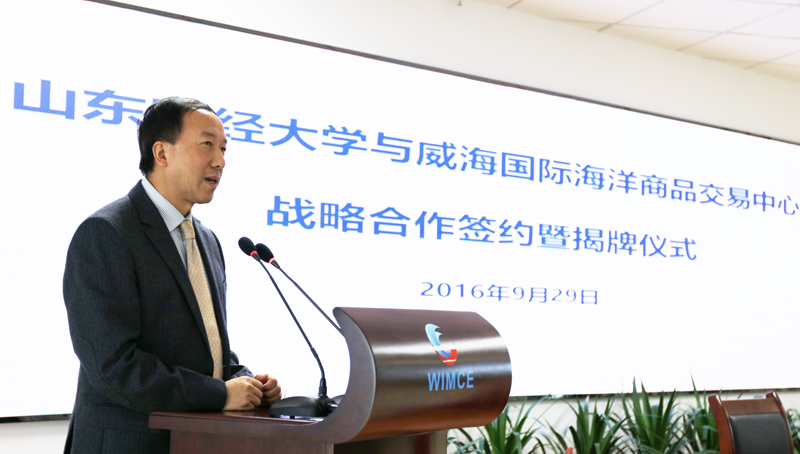 卓志介绍了山东财经大学的基本情况并向关心、支持学校建设和发展的威海及荣成市委市政府以及各界朋友表示衷心的感谢。卓志指出,大学的本质就是积极培养适应社会需求、顶天立地的新时代大学生。同时,现代大学的职能还包括利用自身优势开展多种形式的智力服务,推动地方经济建设。威海国际海洋商品交易中心具有垂直电商、创新金融服务商、跨界投资供应商三大功能定位,同时具有资源集聚和信息集成功能,能够促进荣成海洋渔业产业的资源整合,推动海洋渔业产业向规模化、集约化、信息化、金融化方向发展。企业定位准确、愿景美好,要实现这一蓝图,既需要理论支撑,也需要实践落实,学校希望通过签署合作协议和建立产学研基地与中心互相支持、取长补短、携手前进、共同发展,实现互惠、互利、共赢。卓志强调,企业、政府、高校三方合作将是未来发展的趋势,希望通过合作,将基地变成山财大教师进行科研实践并将其转化为实际应用的重要平台,从而提升山财大的社会影响力和品牌辐射面。