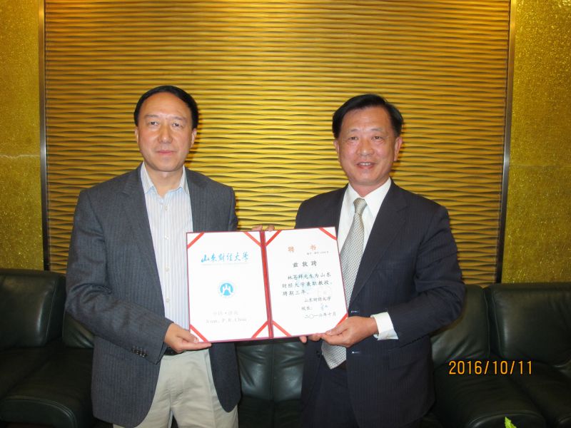 会谈后,卓志向林苍祥颁发了兼职教授聘书。林苍祥是台湾淡江大学财金系教授、博导、两岸金融中心主任。浙江大学恒逸讲座教授、金融研究院特聘专家,台湾大学、厦门大学兼职教授。兼任厦门国际银行独立董事,东森国际董事,亚太电信董事,元大宝华综经院董事等职务。曾任台湾财务工程学会理事长,台湾证交所董事、上市审查委员,台湾期交所监察人、董事。