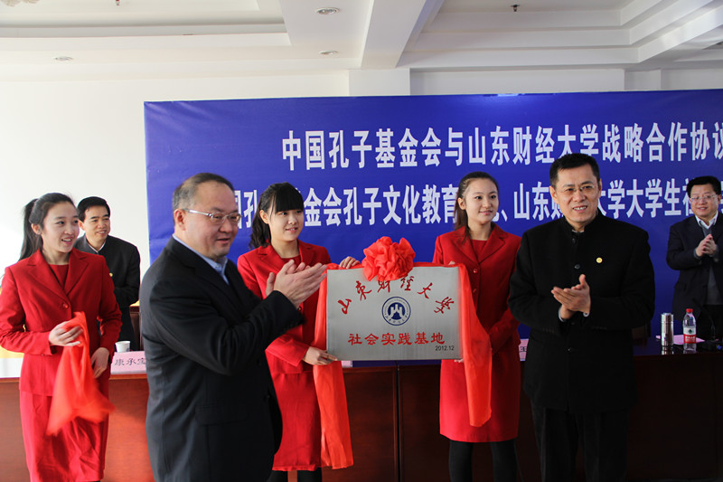 胡文波与康承宝分别代表双方签署双方战略合作协议。王大千与刘兴云共同为中国孔子基金会孔子文化教育基地、山东财经大学大学生社会实践基地揭牌。
